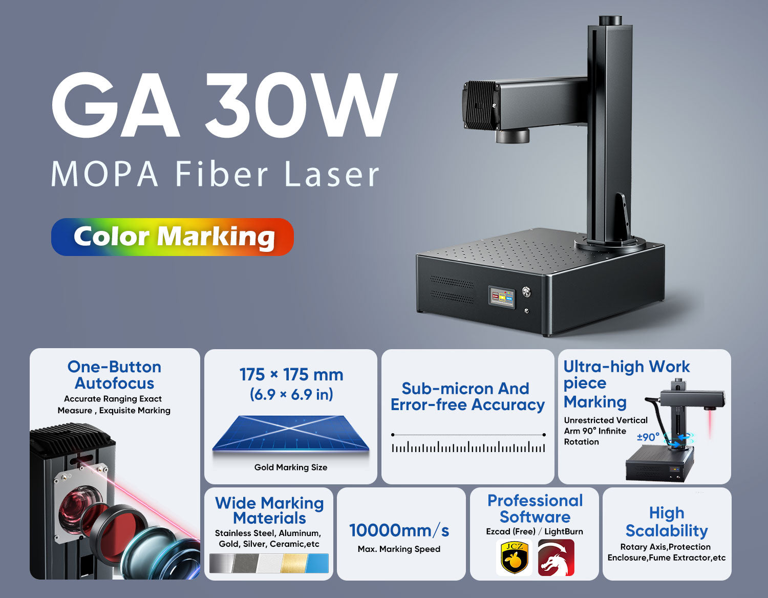 - Monport's GA Upgraded 30W Integrated MOPA Fiber Laser Engraver & Marking Machine offers advanced features such as auto-focus and MOPA technology, enhancing its performance and versatility.