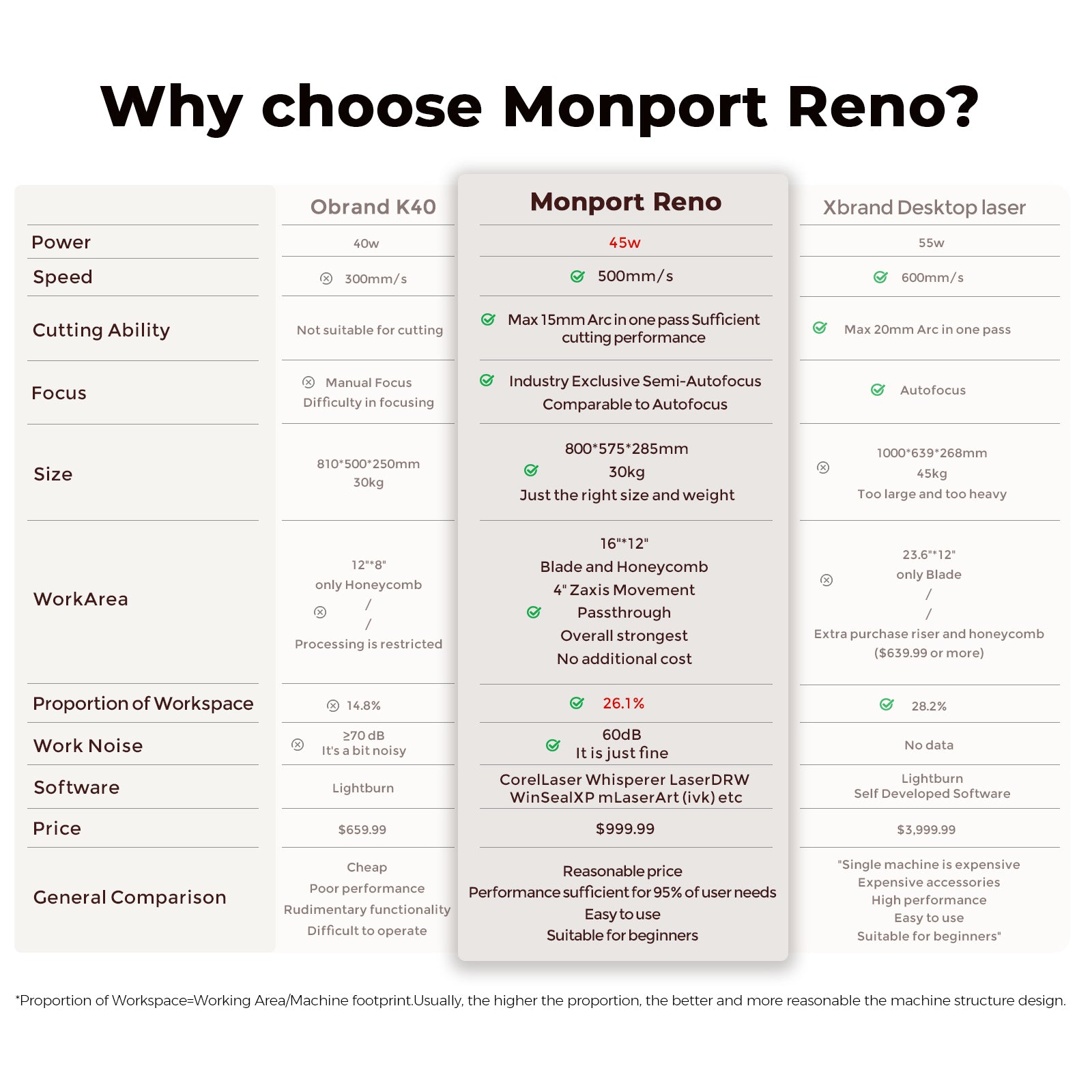 Monport is a leading name in the laser engraving industry, continuously innovating to improve performance and accessibility. Here’s why Monport’s Reno45 45W CO2 Laser Engraver & Cutter is the best choice: