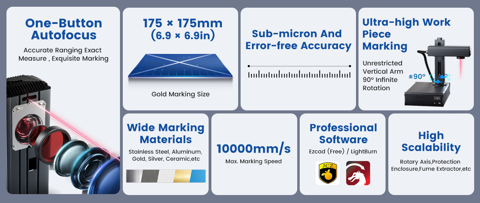 Its aluminum body with integrated optics ensures industrial-grade durability. The vertical arm's ±90° rotation allows you to mark surfaces at any angle — a major plus when working with curved tumblers. Setup is also effortless thanks to the foldable vertical arm and one-minute installation design, so you can start engraving the moment your machine arrives.