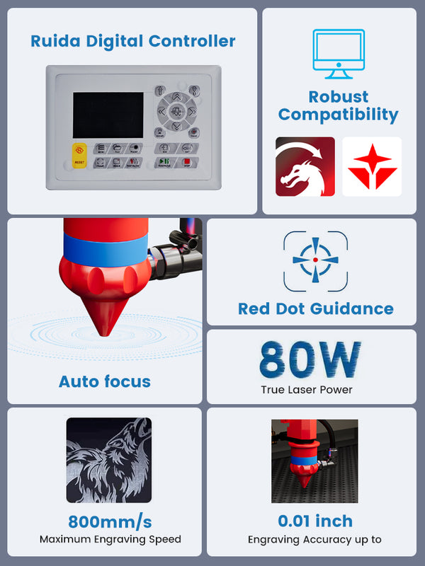 Whether your chosen software is LightBurn, RDworks, AutoCAD, or CorelDRAW, this Ruida digital controller can support the given platform. The Ruida Controller with a digital display can control the laser head, start or stop projects, adjust laser power and speed settings and so on.