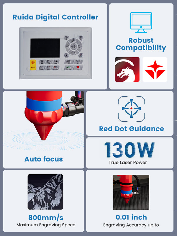 : Autofocus means distance is automatically calculated and focus is automatically corrected at the touch of a button via the ruida control panel - no more manual testing and adjustments.
