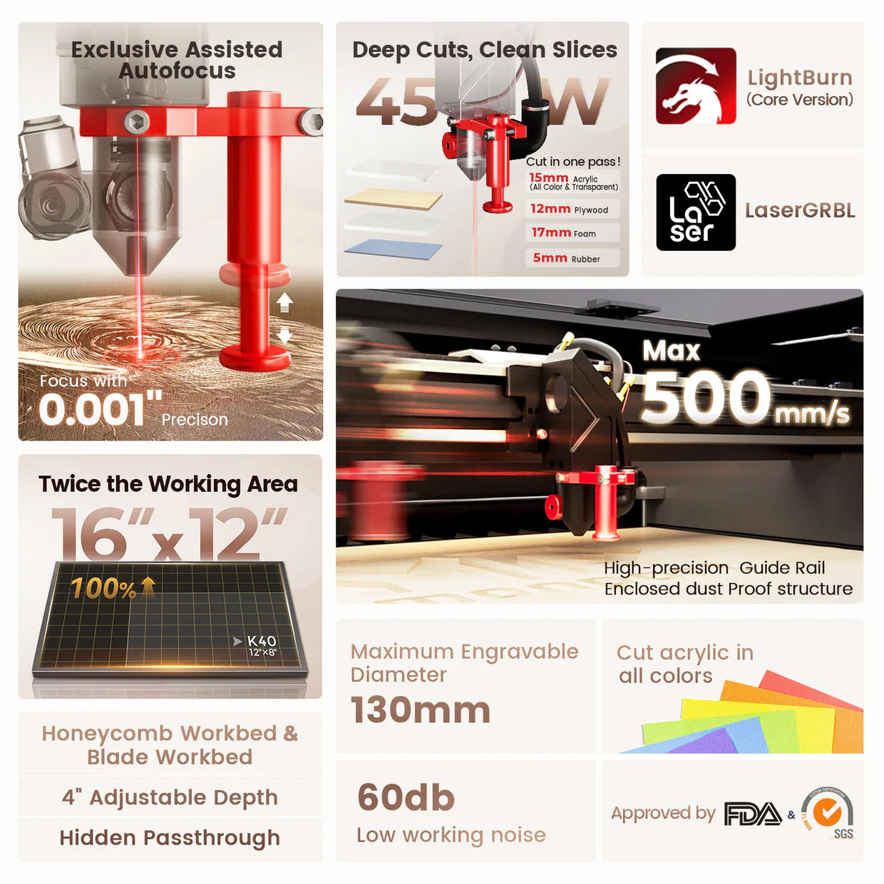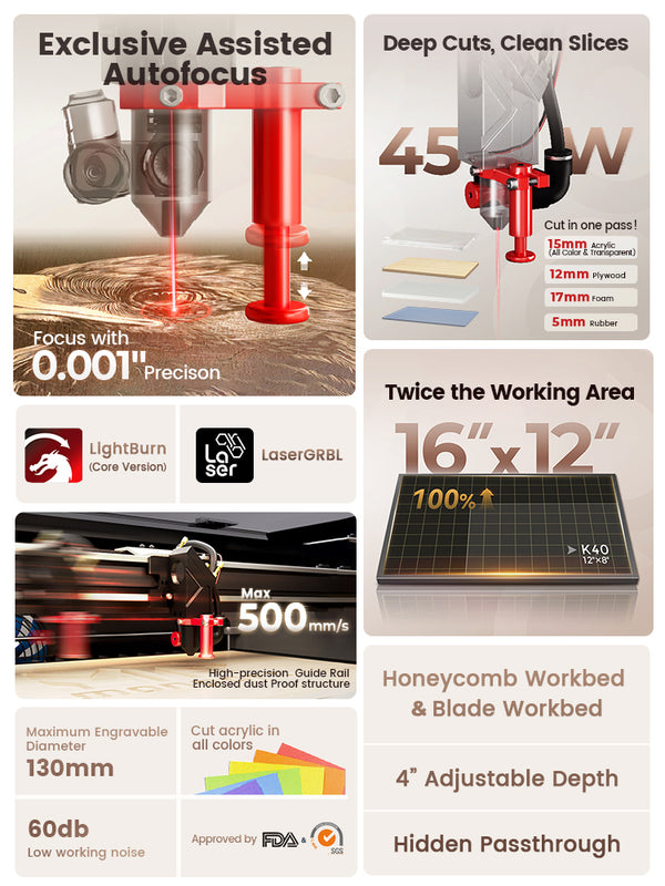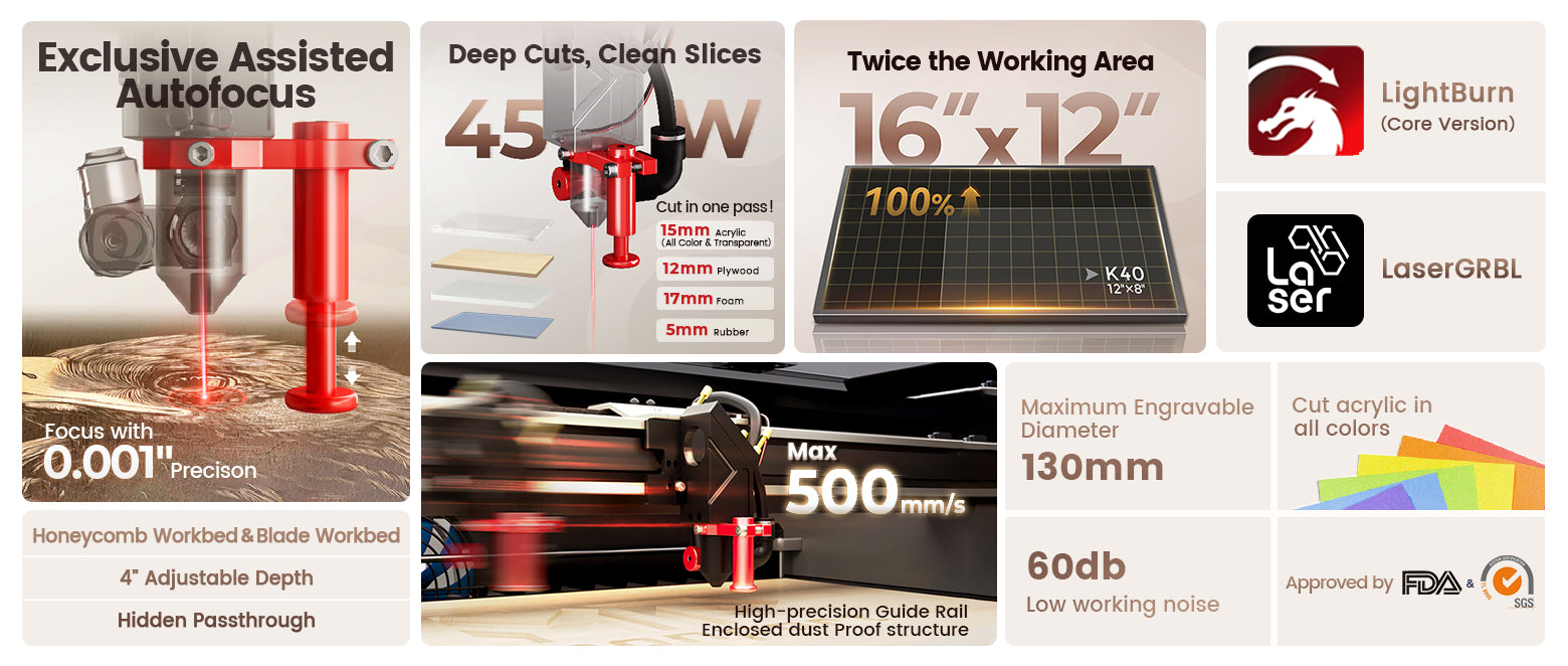 Featuring excellent noise control, this laser operates with minimal sound, making it ideal for home or office use. The precise red light indication allows for accurate alignment of your projects, enhancing precision during engraving and cutting. Equipped with a silent assist air system, exhaust system, and water pump, it efficiently removes smoke and debris without generating excess noise, contributing to a peaceful workspace.