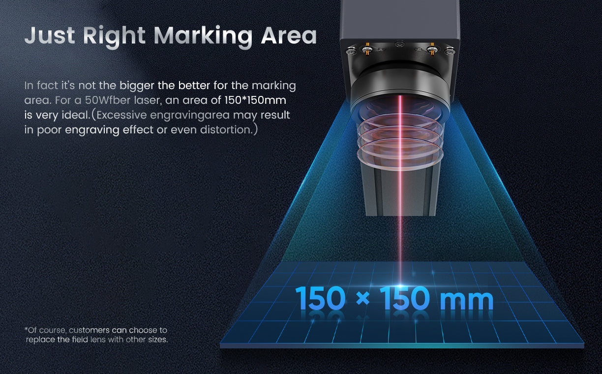 For a 50W fiber laser, an area of 150*150mm is optimal, as excessive engraving area may result in poor engraving effect or even distortion.After special tuning by Monport, even when carving at the edges, there will be no weak light.