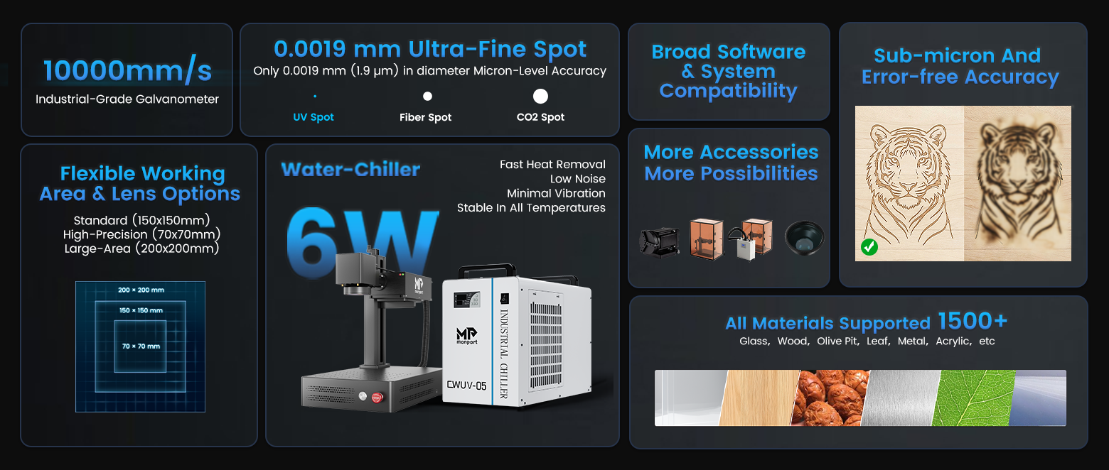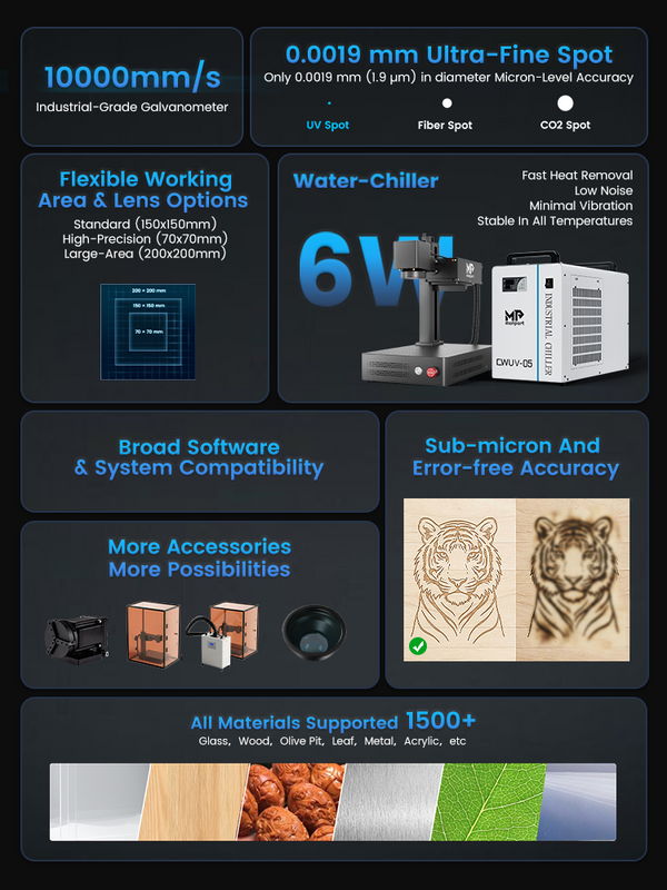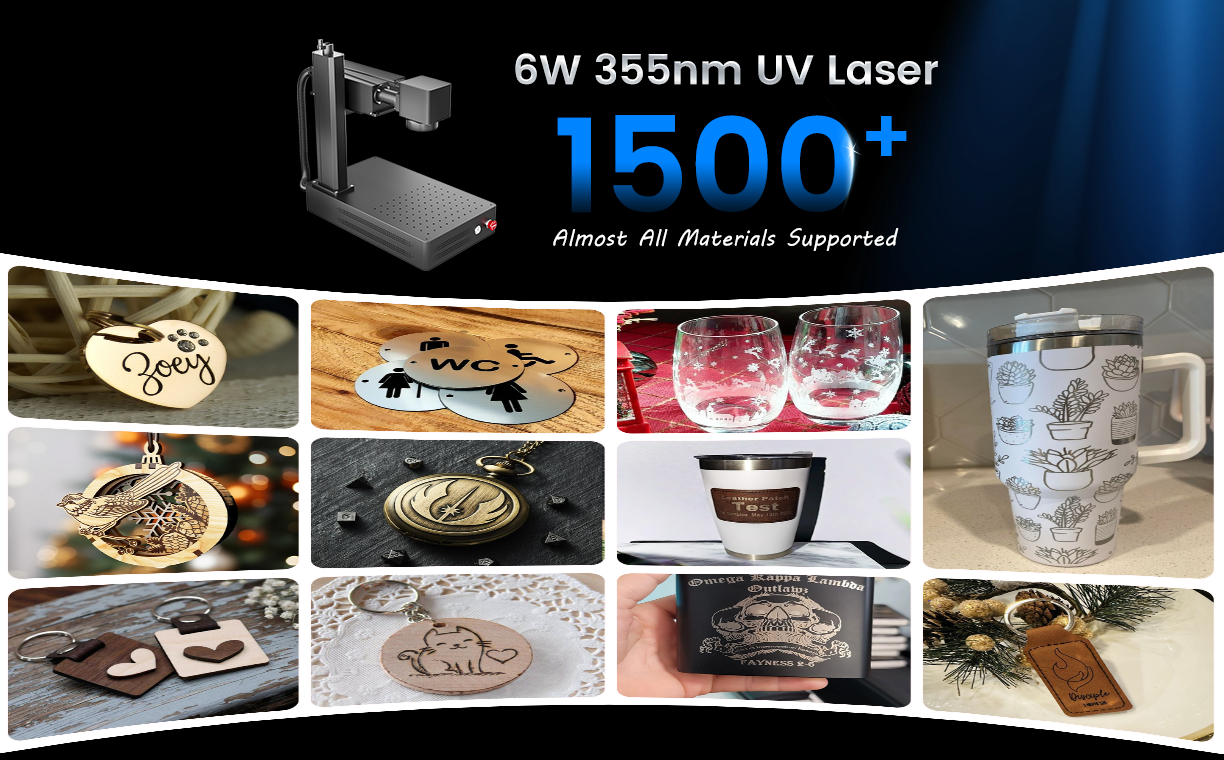 Whether metal or non-metal, transparent or opaque, UV laser can engrave a wide range of materials—over 1500 types.They stand out significantly compared to CO2, diode laser, and fiber laser engravers on the market.