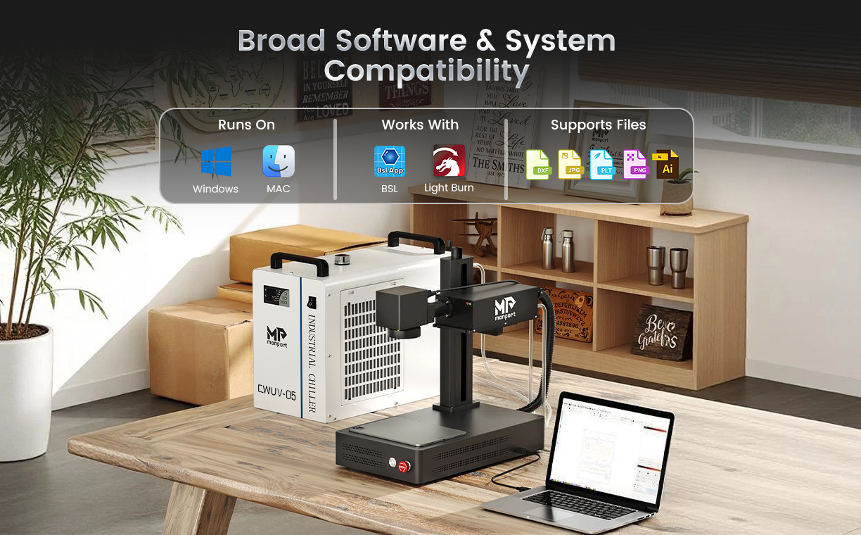 Water Chiller integration ensures efficient laser operation.