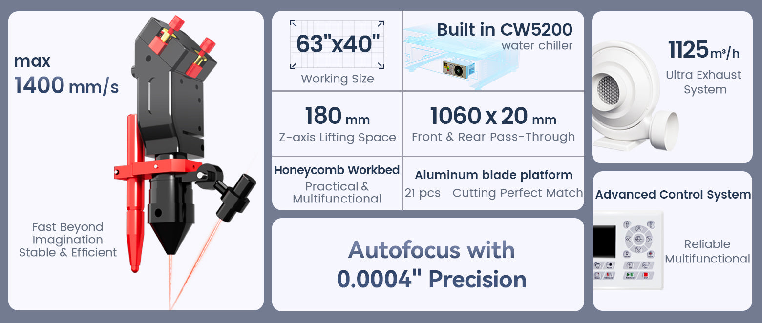 | Product Name | 90 W Effi9S Built-in Chiller CO₂ Laser (36" × 24") | 100 W Effi10S Built-in Chiller CO₂ Laser (40" × 24") | 130 W Effi13S Built-in Chiller CO₂ Laser (51" × 35") | 150 W Effi16S Built-in Chiller CO₂ Laser (63" × 40") |