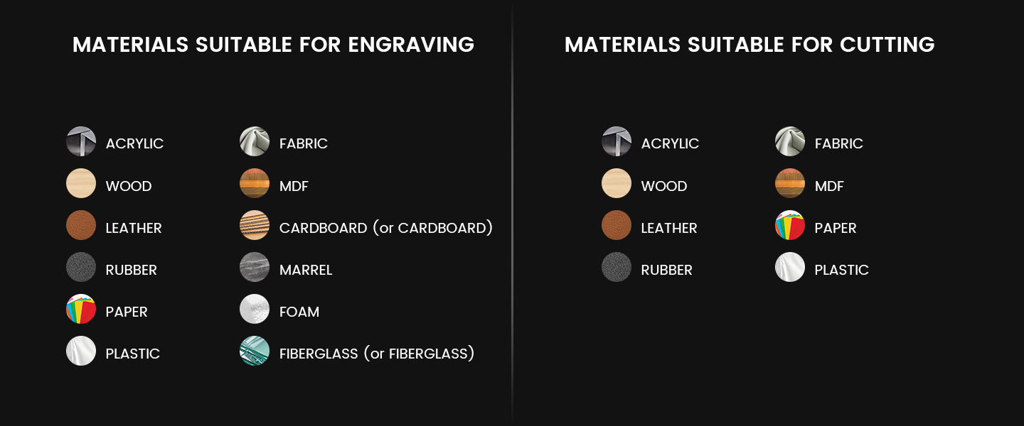 | Materials Suitable for Engraving | Engrave: wood, acrylic, glass, fabric, leather, paper, cardboard, rubber, stone, anodized Al, etc. Cut: wood, acrylic, fabric, leather, paper, cardboard, rubber, etc. |