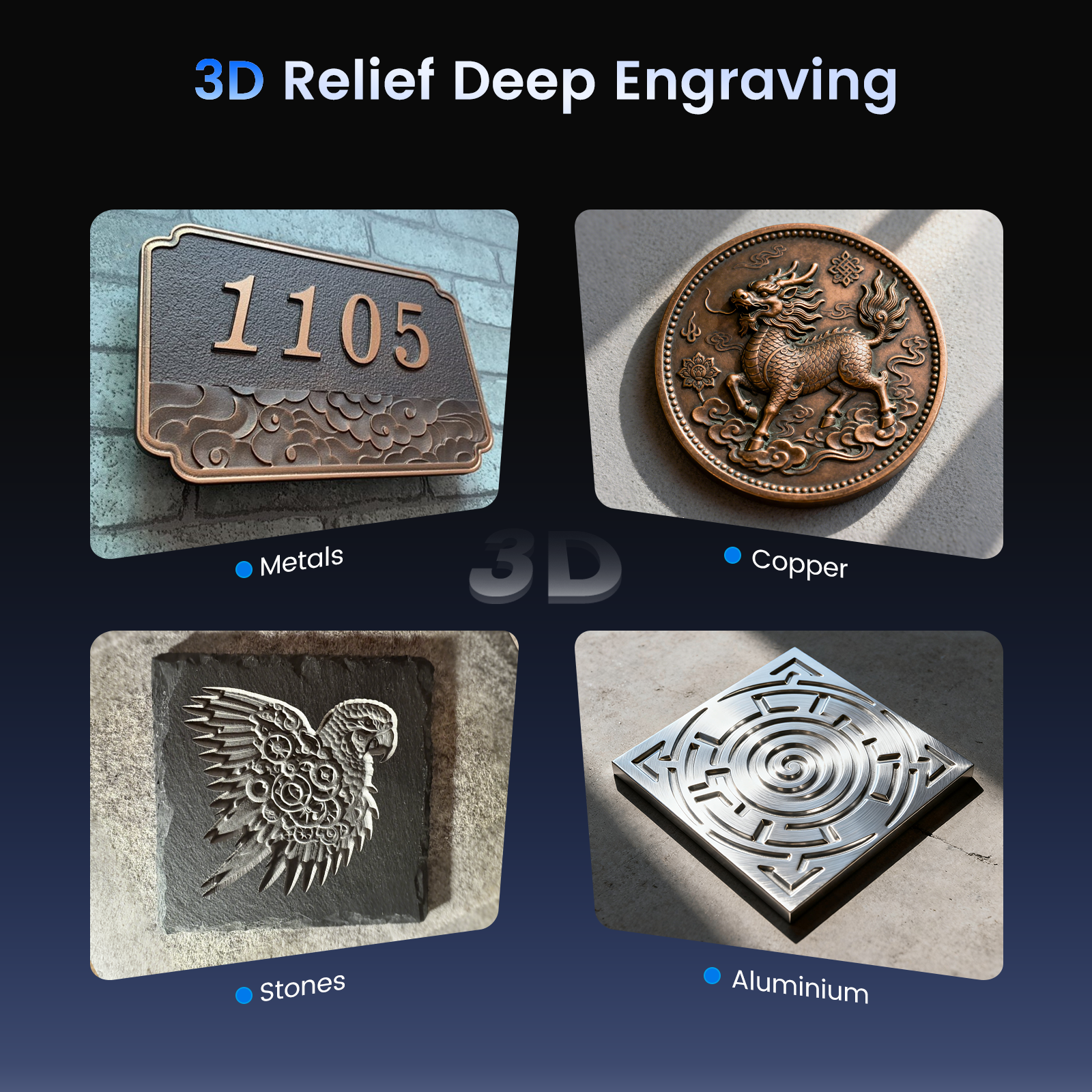 The higher the power, the deeper the engraving. Achieve precise deep carvings and stunning 3D reliefs with unmatched clarity and detail. Ideal for intricate designs that require depth and texture, our GT Series elevates your creativity to new dimensions.