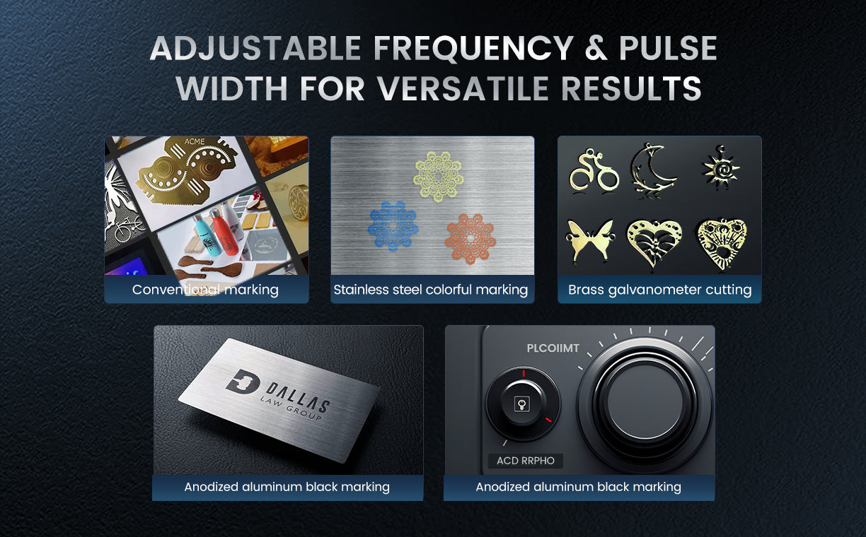 Monport GPro MOPA Fiber Laser, with adjustable frequency (1-3000kHz) and pulse width (2-500ns), enables vibrant stainless steel markings, anodized aluminum black engraving, precise cutting, drilling, and intricate designs on plastic buttons. Experience rich and precise visual effects with ease.