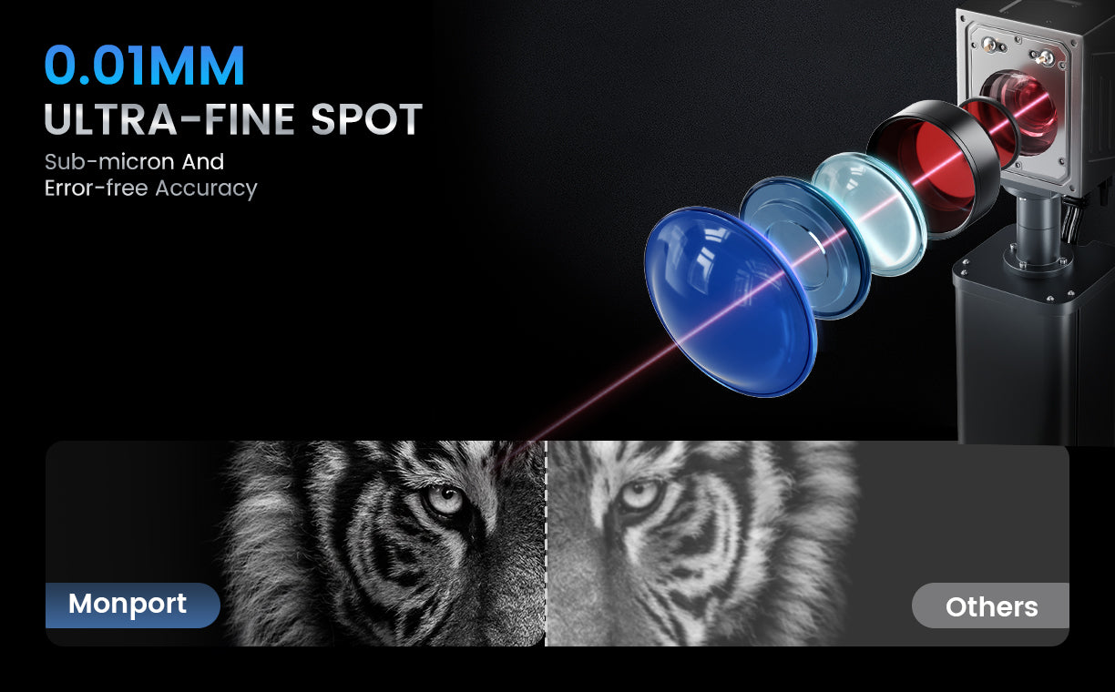 Experience the pinnacle of engraving accuracy with the Monport GPro MOPA Fiber Laser, featuring sub-micron high-precision technology. Designed for professionals who demand nothing but the best, the state-of-the-art GPro MOPA fiber laser redefines precision, allowing you to create intricate designs and detailed colorful markings with unparalleled clarity.