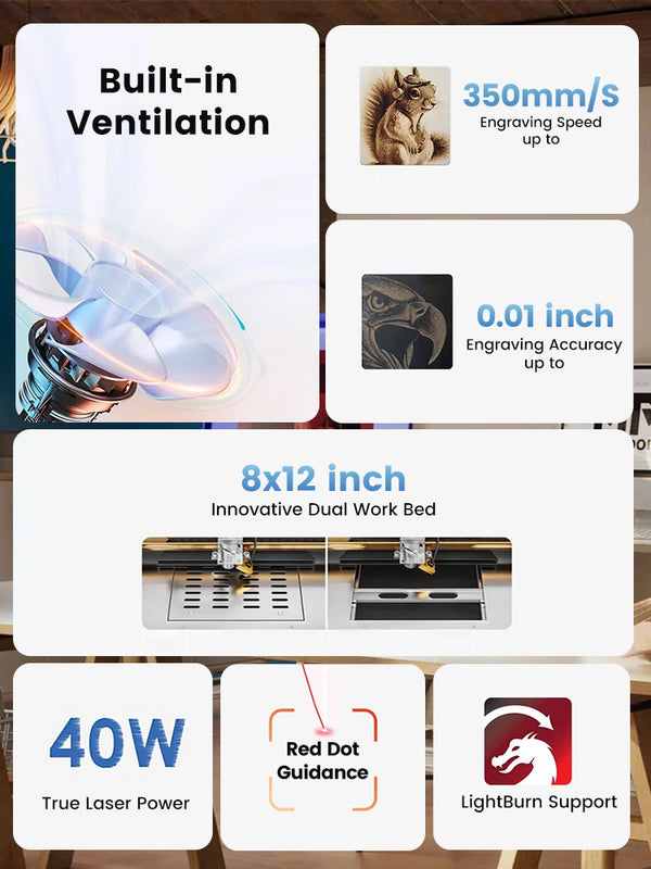 Built-in air assist enhances the engraving precision, ensuring that the final artwork is clear and clean. Significantly reduce the carbonization effects when engraving on wood, delivering flawless results every time.