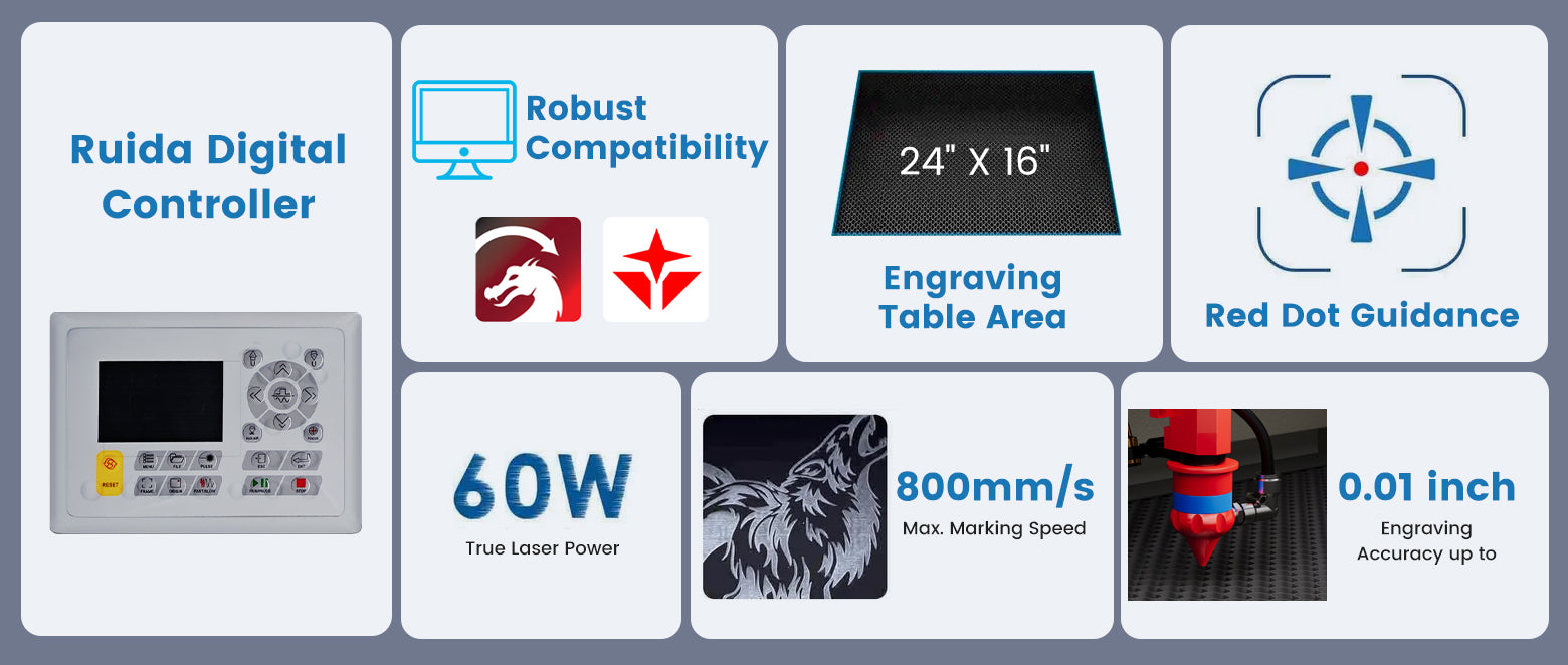 | Compatible Software | Lightburn, RDWorks, Coreldraw, Auto-CAD | Lightburn, RDWorks, CorelLaser |
