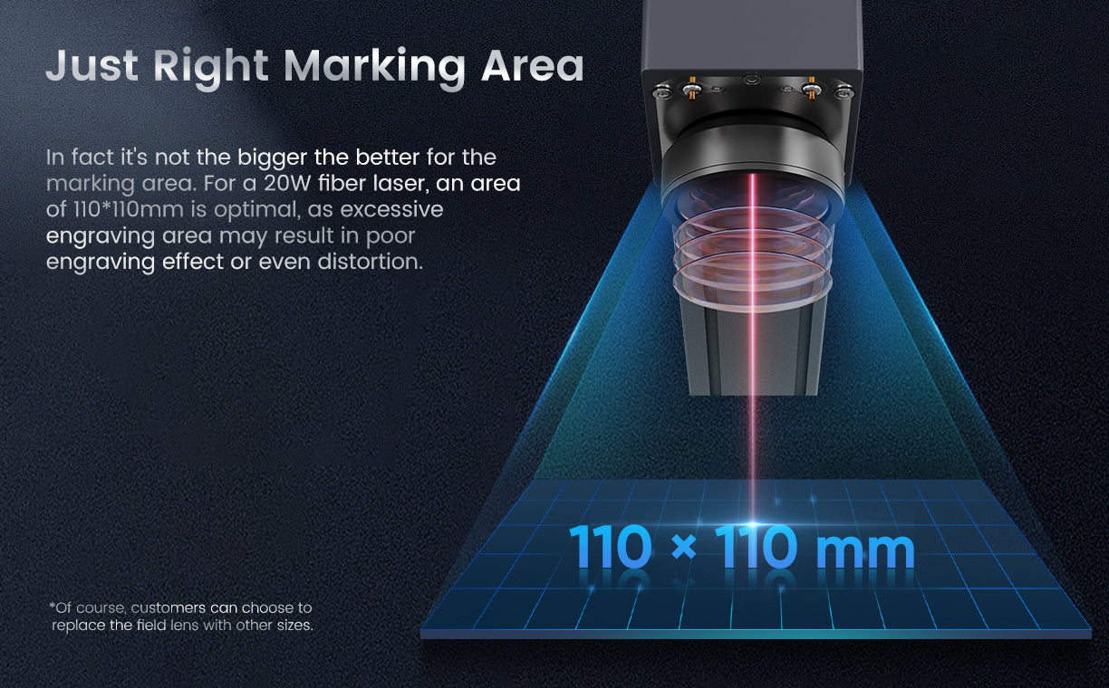 For a 20W fiber laser, an area of 110*110mm is optimal, as excessive engraving area may result in poor engraving effect or even distortion.After special tuning by Monport, even when carving at the edges, there will be no weak light.