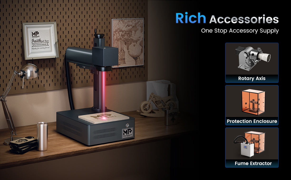 You can pair it with a rotary (marking circular objects), a smoke purifier (absorbing smoke and dust), a protective cover (noise reduction, safety), and all of which are sold in Monport stores.