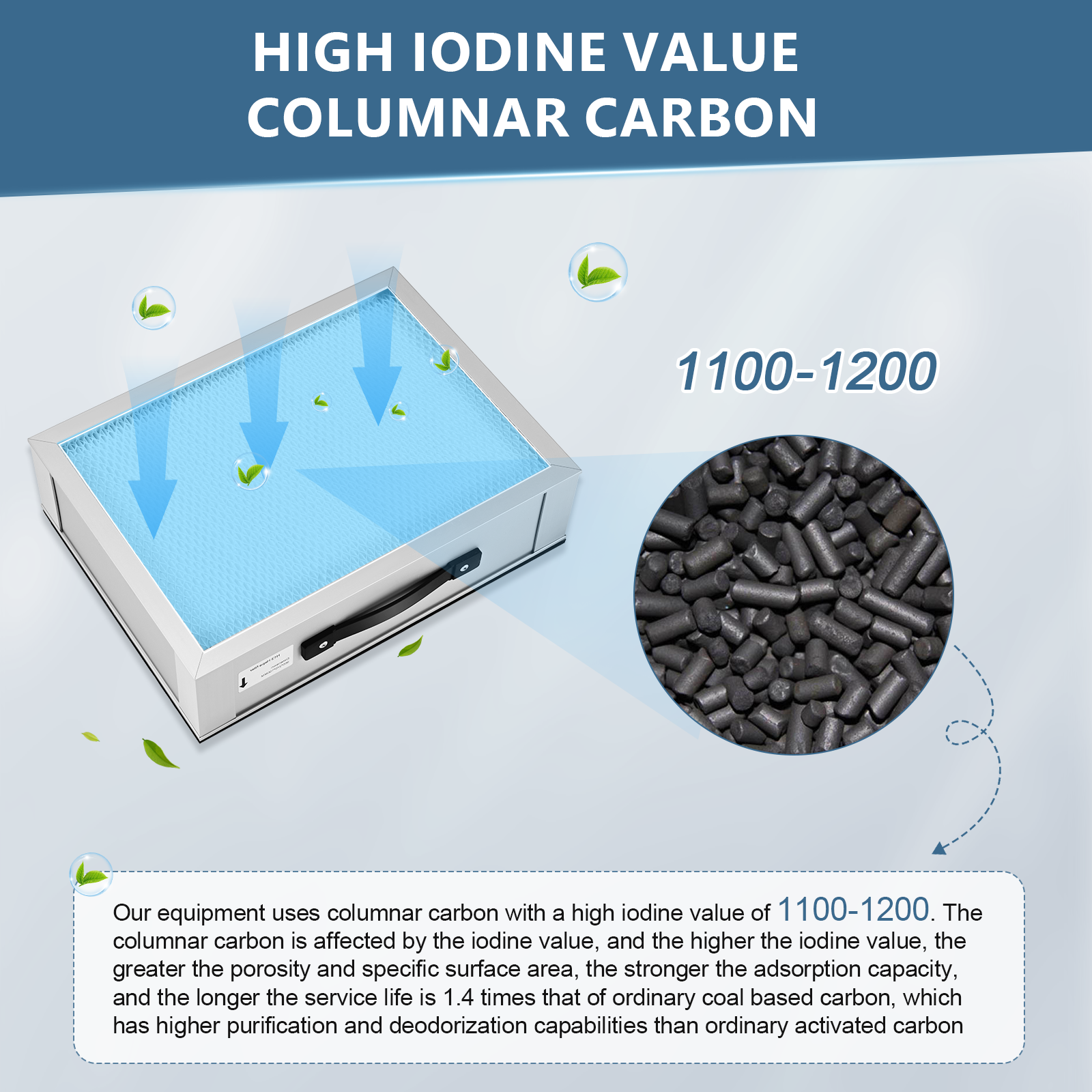 Monport's box type medium efficiency filter effectively filters dust particles above 0.3 microns in the air; High iodine activated carbon filters effectively absorb toxic gases, smoke, and odors. Suitable for 350W smoke purifiers.