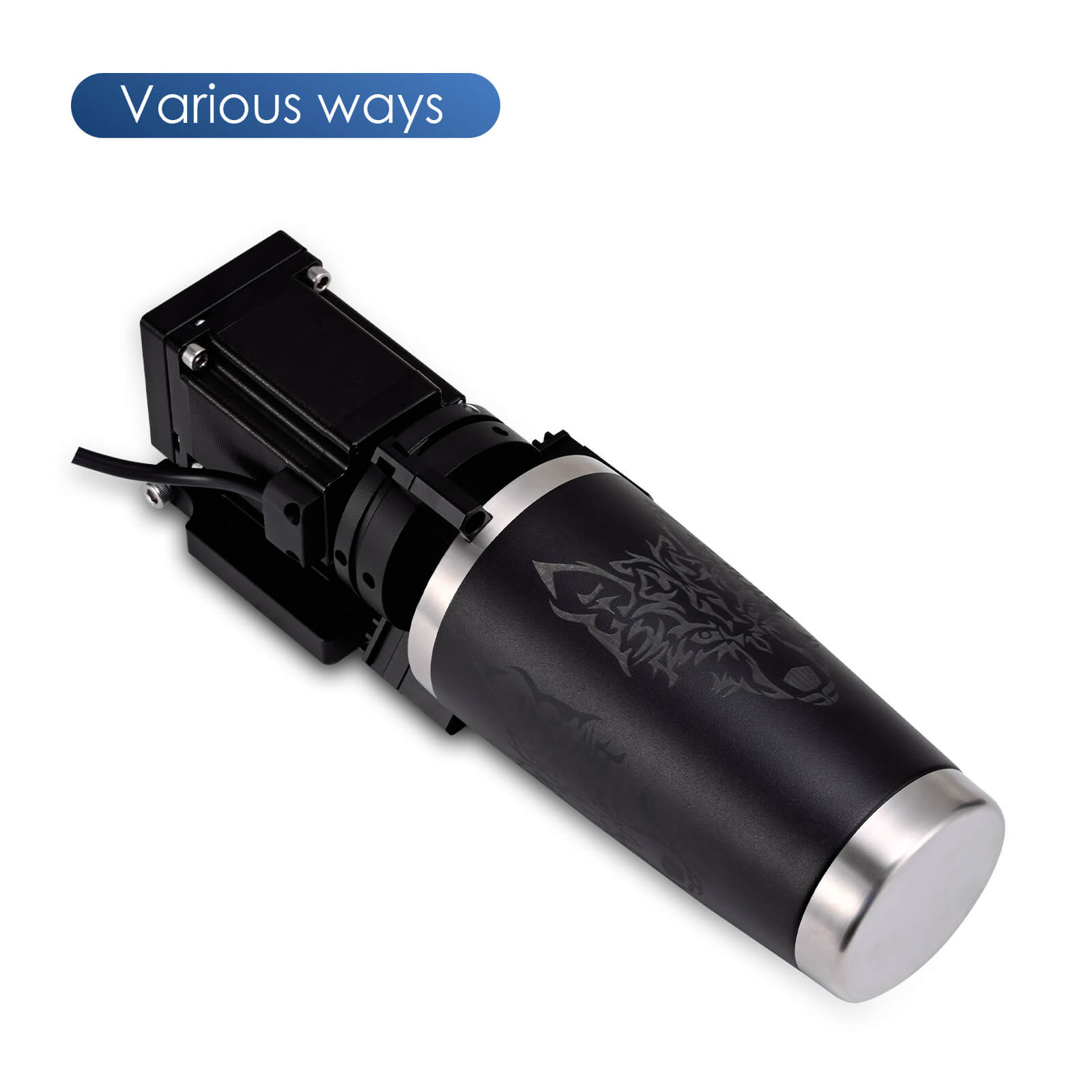 This laser engraving machine rotary accessory includes three chuck jaws and three pins, which can be extended to 4.5 inches (114 mm) and can be pushed or pushed out by its pins to fix the external 0-4.5 inch rings and cylinders. The flexible adjustment function allows carving operations on any size ring, bracelet, anklet, bottle, cup, disc, etc. within the range.